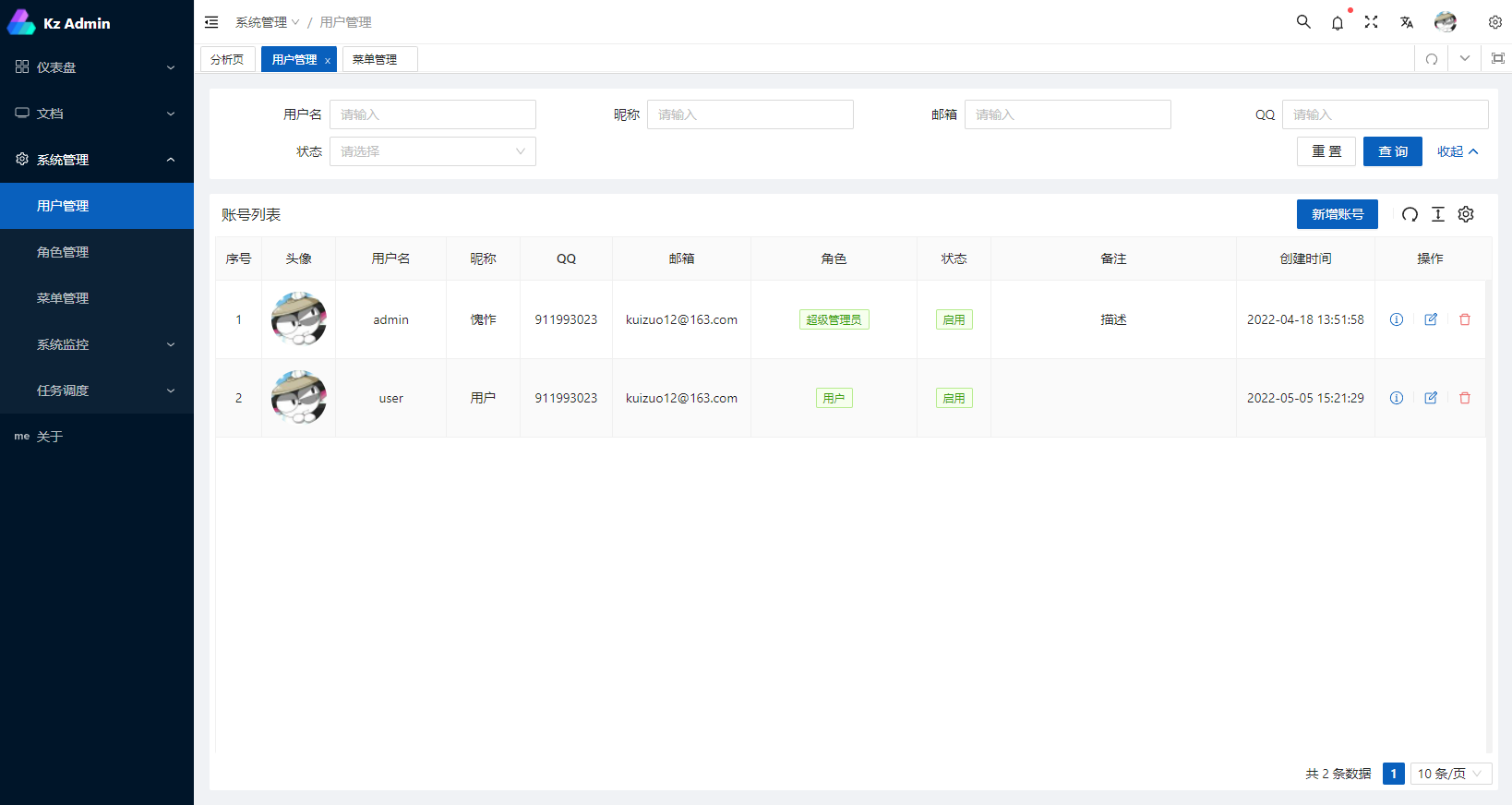 演示地址:KzAdmin 管理员账号:admin 密码:123456